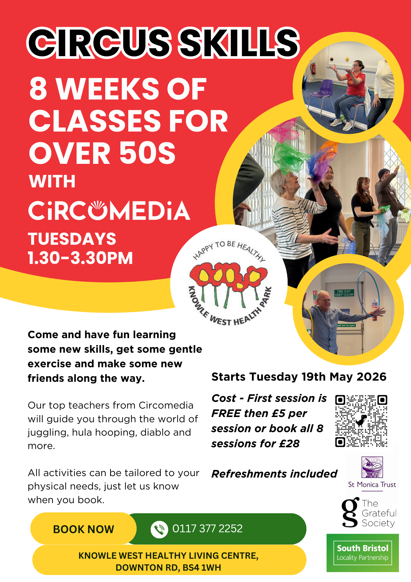 We have another 8 weeks of Circus Skills for over 50s starting on Tuesday 19th May! Come and join the fun! Learn a bit of juggling, master spinning the diablo, try out spinning plates and much more! Our expert teachers from Circomedia will guide you through each session and can tailor the activities to all abilities. First session is FREE for all new members.